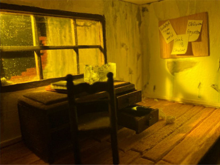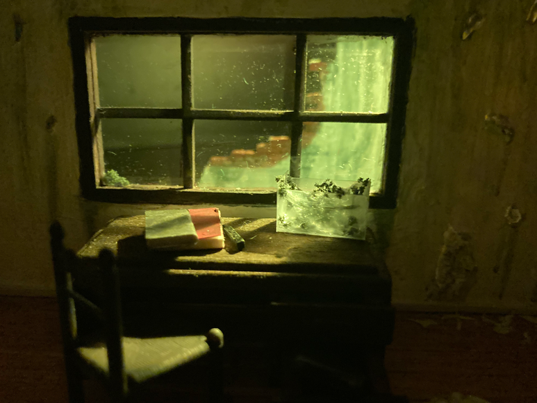 "Death is not the end of life, forgetting is." The Spanish book "Yellow Rain" tells the story of leaving and forgetting the land of aeneno, a village where people left after the mill closed. The last scene of the book is of an old man who was found covered in moss, and on his last night he recalls the experience of his life, looking at the ruins a n d the cruel cold moonlight. This reminds me of my hometown, in fact, there are countless old people living alone in such a small village. People will eventually be old and lonely, this may be life, but before people feel lonely, whether we can more or less reduce the feeling of loneliness. People lost their bonds and entered an era of "no society". Therefore, I made this scene in combination with the recent rainy day in London, with dark clouds gathering outside the window and a sense of apocalypse: a n abandoned house in a remote mountain, a broken cabinet, and the window glass covered with green algae....